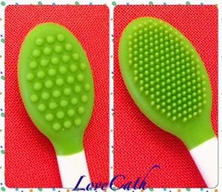 左面的綠色矽膠按摩器, 於潔面時用以按摩角質死皮厚重的位置